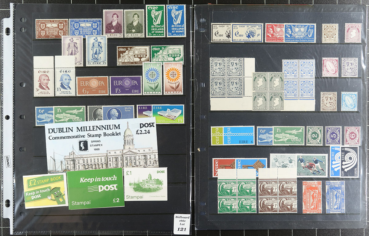 Collection / accumulation of mint Ireland, 1920's-2000's, containing many hundreds of stamps in 23 stock pages. The lot generally ranges from Scott #53/1369, containing mostly commemorative singles and many sets, along with a few booklet panes, noting some catalogue values in the $10 to $20 and up for each. Duplication up to 3 and up for a few issues. A very nice clean lot for all collectors. Owner's older 2020 Scott US$1,821.00 =