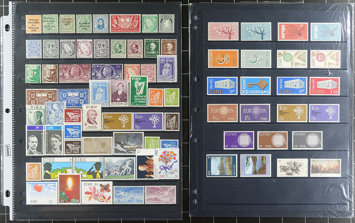 Collection / accumulation of mint Ireland, 1920's-2000's, containing many hundreds of stamps in 23 stock pages. The lot generally ranges from Scott #53/1369, containing mostly commemorative singles and many sets, along with a few booklet panes, noting some catalogue values in the $10 to $20 and up for each. Duplication up to 3 and up for a few issues. A very nice clean lot for all collectors. Owner's older 2020 Scott US$1,821.00 =