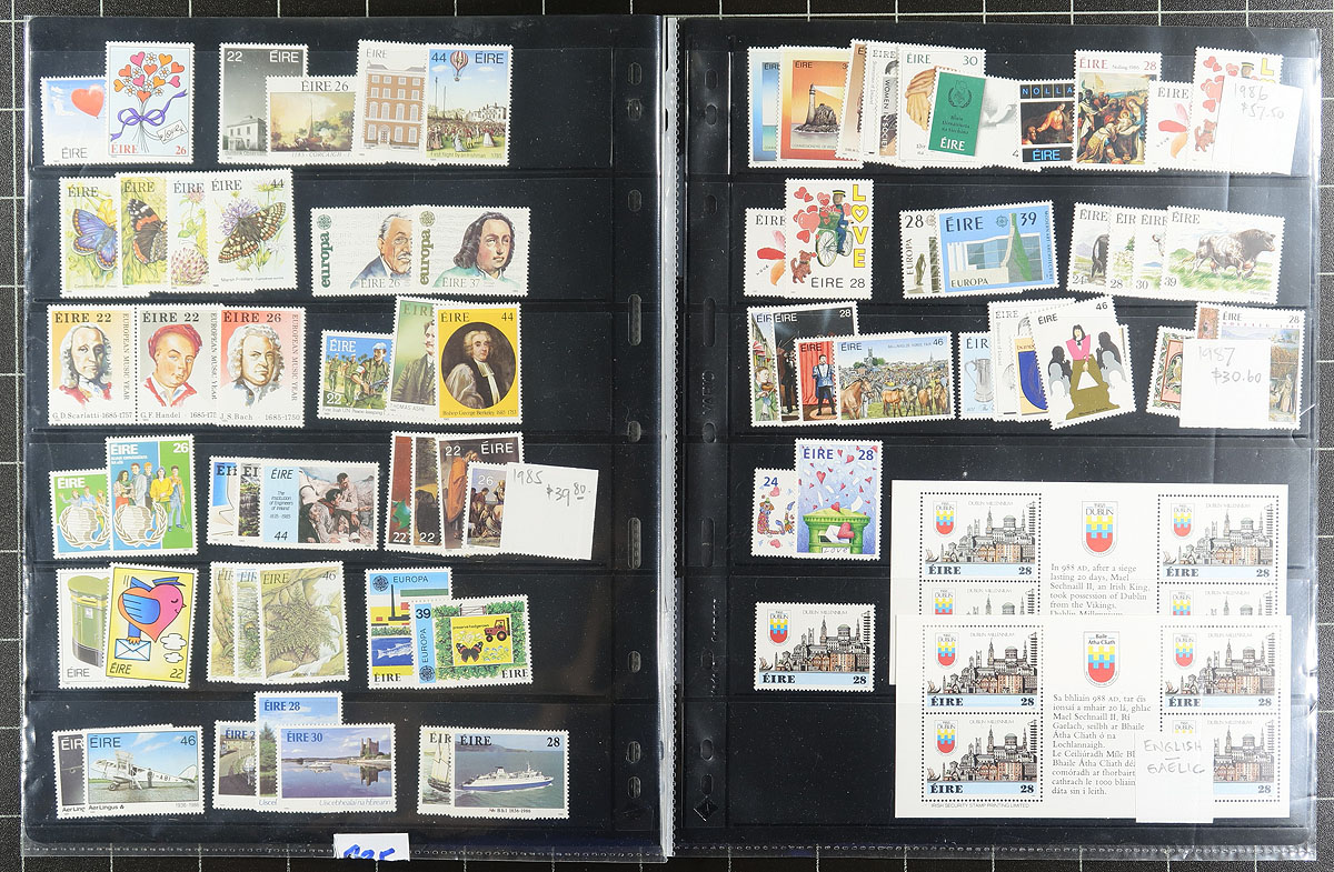 Collection / accumulation of mint Ireland, 1920's-2000's, containing many hundreds of stamps in 23 stock pages. The lot generally ranges from Scott #53/1369, containing mostly commemorative singles and many sets, along with a few booklet panes, noting some catalogue values in the $10 to $20 and up for each. Duplication up to 3 and up for a few issues. A very nice clean lot for all collectors. Owner's older 2020 Scott US$1,821.00 =