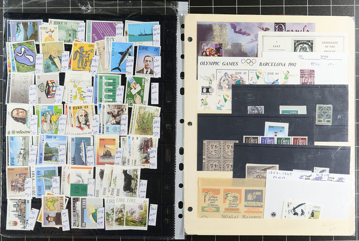 Collection / accumulation of mint Ireland, 1920's-2000's, containing many hundreds of stamps in 23 stock pages. The lot generally ranges from Scott #53/1369, containing mostly commemorative singles and many sets, along with a few booklet panes, noting some catalogue values in the $10 to $20 and up for each. Duplication up to 3 and up for a few issues. A very nice clean lot for all collectors. Owner's older 2020 Scott US$1,821.00 =