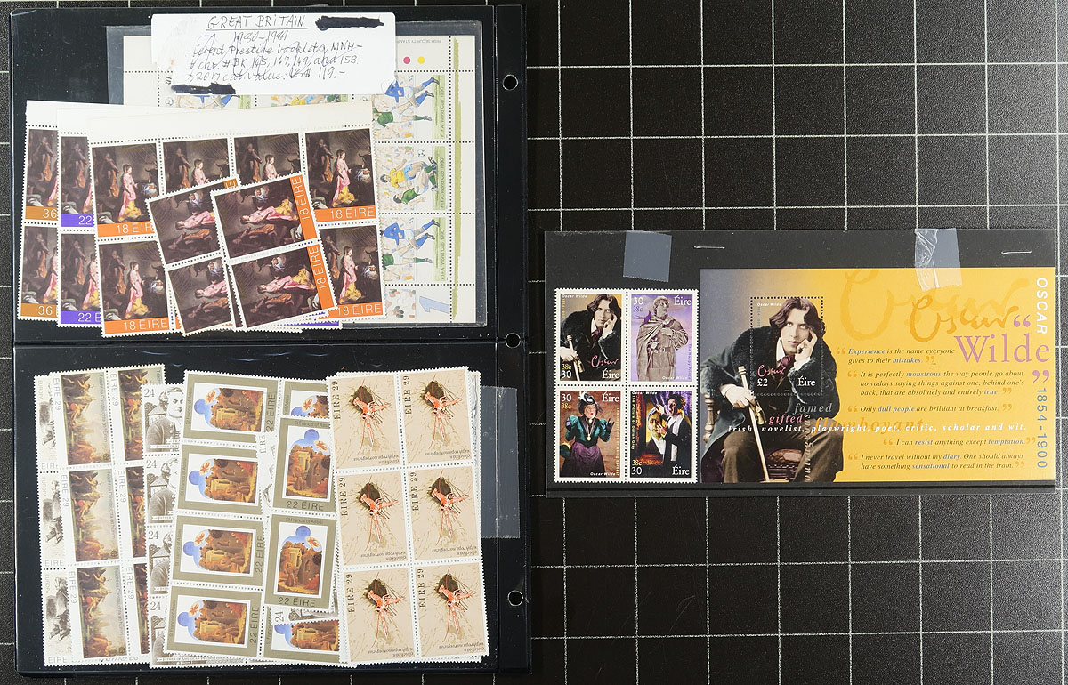 Group of never hinged Ireland collected for blocks and sheetlets, 1970's-2000's all in several stock pages. The lot generally ranges from Scott #326a/1962b, containing several blocks and multiples, along with some souvenir sheets and sheetlets.. A nice clean lot for collectors and dealers alike. Owner's older 2020 Scott US$722.00 =