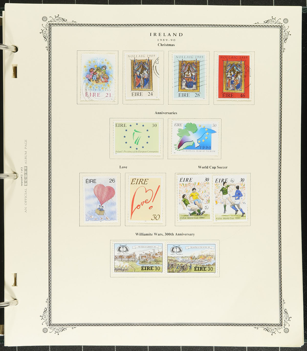Collection of primarily used Ireland in a Scott Specialty album with slipcase (note, the album does say Canada on the spine, but the innards are pure Irish), containing many hundreds of stamps on pages ranging from 1922-2009. The collection ranges from Scott #65/1840, and also includes a few stock pages of used stamps (presumably to be added to the pages, or owner's duplicates). A cursory check of catalogue values indicated a few singles, sets, and partial sets in the $5 to $10 range and up. A nice basis and should be expanded in future. Estimate =