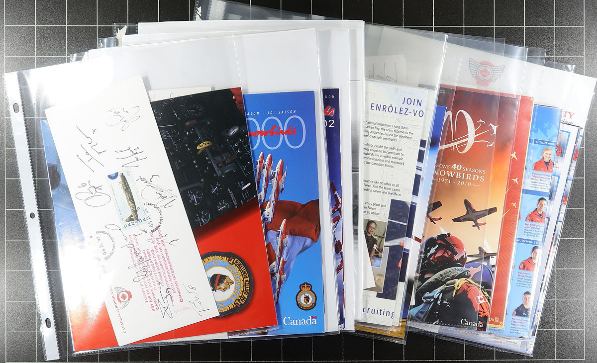 Snowbirds. Lovely group of roughly 20 Snowbird signed covers, 1999-2007, 2010-2013, almost all signed by the 9 pilots, and a few with individual pilot signatures. Each year also includes the promotional brochure and a few photographs. Most covers originally retailed in the $25 range each, with only a limited number produced for each year. Ideal for the aerophilatelist, or for topical and thematic collectors. Estimate =