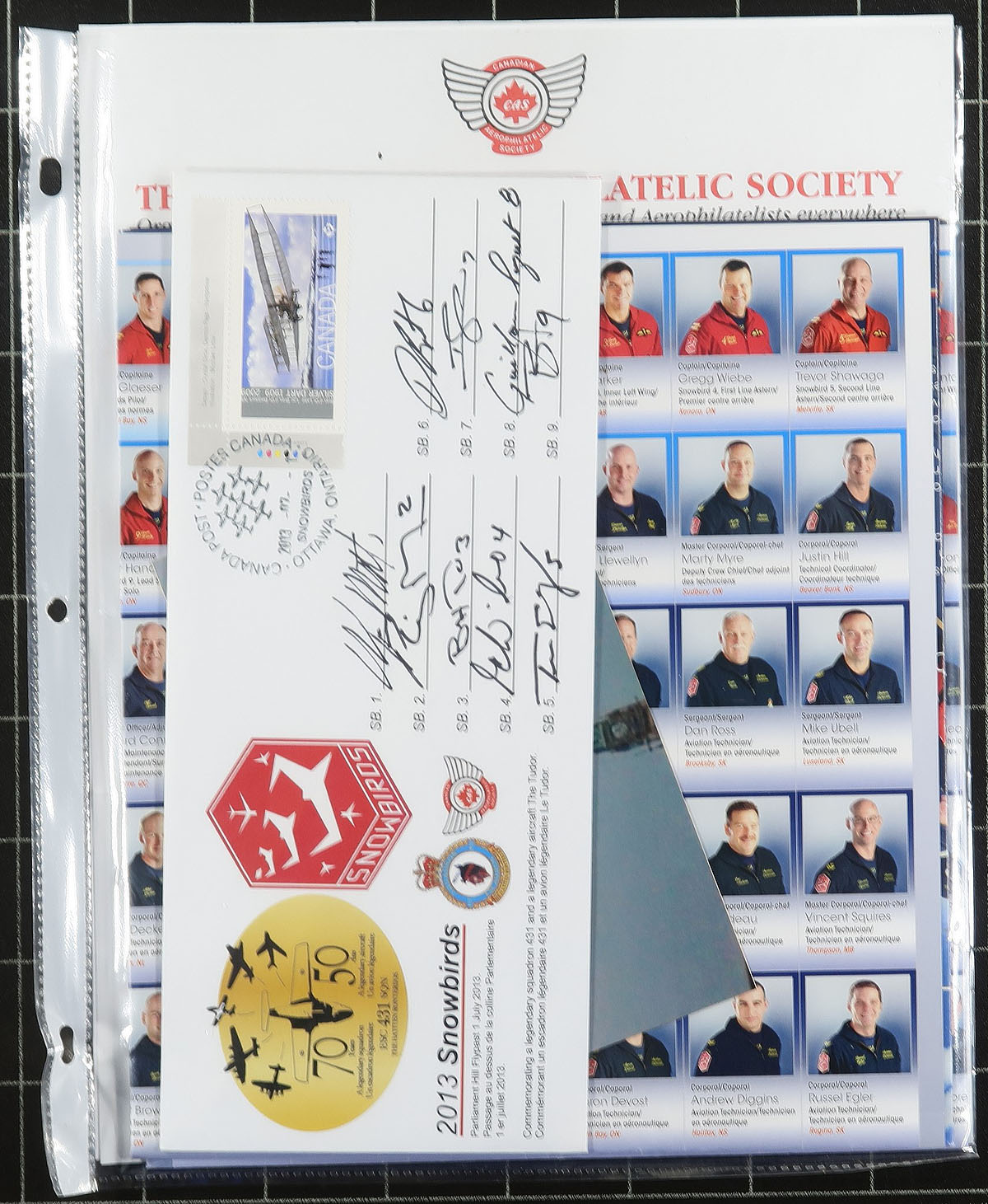 Snowbirds. Lovely group of roughly 20 Snowbird signed covers, 1999-2007, 2010-2013, almost all signed by the 9 pilots, and a few with individual pilot signatures. Each year also includes the promotional brochure and a few photographs. Most covers originally retailed in the $25 range each, with only a limited number produced for each year. Ideal for the aerophilatelist, or for topical and thematic collectors. Estimate =