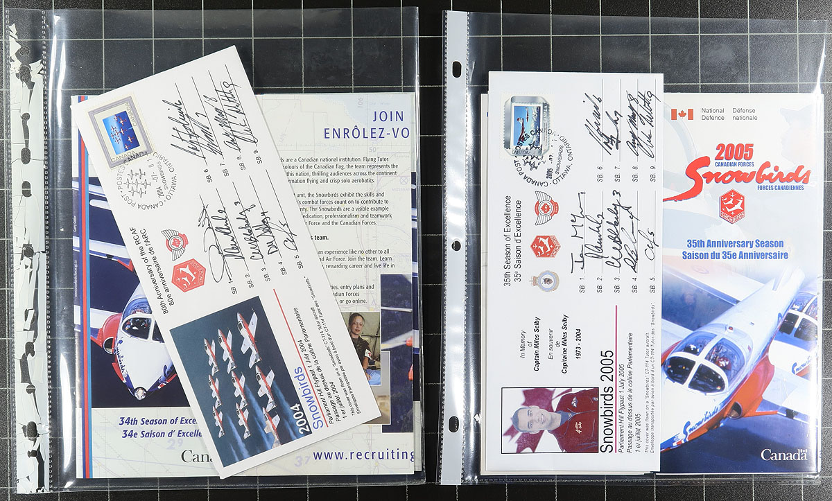 Snowbirds. Lovely group of roughly 20 Snowbird signed covers, 1999-2007, 2010-2013, almost all signed by the 9 pilots, and a few with individual pilot signatures. Each year also includes the promotional brochure and a few photographs. Most covers originally retailed in the $25 range each, with only a limited number produced for each year. Ideal for the aerophilatelist, or for topical and thematic collectors. Estimate =