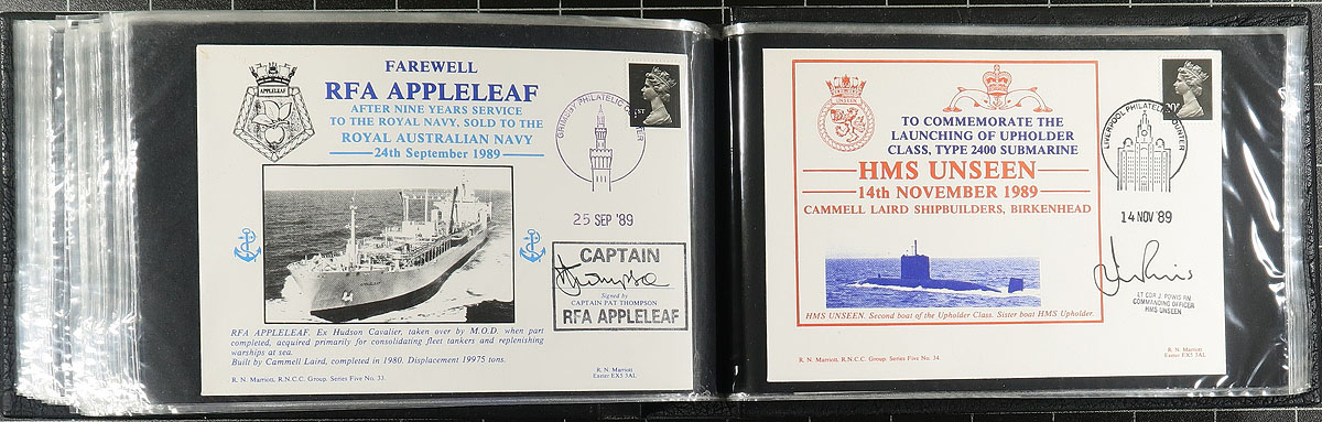Military / Forces Anniversary Covers (many signed). Clean collection of roughly 185 Great Britain commemorative Royal Navy covers in three cover albums, from a few different series, commemorating many important events, participants, battles. deployments, etc., from World War II to more modern events. Every cover appears to be signed by one or more participants relating to the topic at hand, including W. J. Farley, survivor of the HMS Dragonfly as an example. The lot also includes a few picture post cards. A nice lot for the military, topical and thematic collector. Estimate =