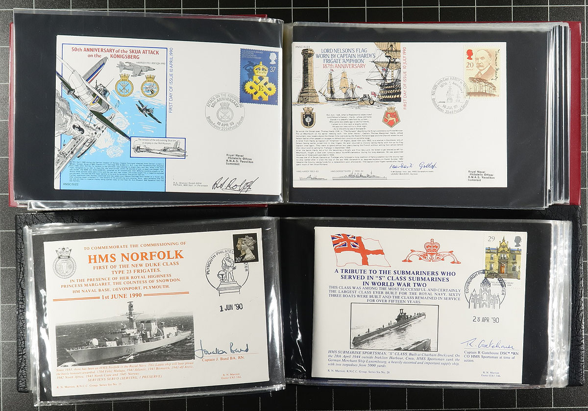 Military / Forces Anniversary Covers (many signed). Clean collection of roughly 185 Great Britain commemorative Royal Navy covers in three cover albums, from a few different series, commemorating many important events, participants, battles. deployments, etc., from World War II to more modern events. Every cover appears to be signed by one or more participants relating to the topic at hand, including W. J. Farley, survivor of the HMS Dragonfly as an example. The lot also includes a few picture post cards. A nice lot for the military, topical and thematic collector. Estimate =