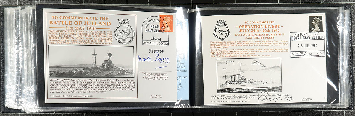 Military / Forces Anniversary Covers (many signed). Clean collection of roughly 185 Great Britain commemorative Royal Navy covers in three cover albums, from a few different series, commemorating many important events, participants, battles. deployments, etc., from World War II to more modern events. Every cover appears to be signed by one or more participants relating to the topic at hand, including W. J. Farley, survivor of the HMS Dragonfly as an example. The lot also includes a few picture post cards. A nice lot for the military, topical and thematic collector. Estimate =