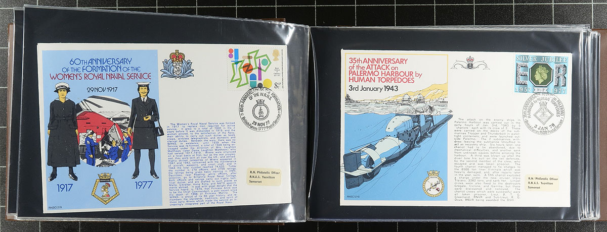 Military / Forces Anniversary Covers (many signed). Clean collection of roughly 250 Great Britain military commemorative covers in three cover albums, from a few different series. The majority of covers relate to the Royal Navy, along with a few from the Royal Air Force, commemorating many important events, ships, planes, participants, battles, and more, ranging from World War I to the 1990's. Many covers appear to be signed by one or more participants relating to the topic at hand. A nice lot for the military, topical or thematic collector. Estimate =