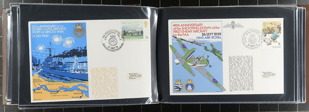 Military / Forces Anniversary Covers (many signed). Clean collection of roughly 250 Great Britain military commemorative covers in three cover albums, from a few different series. The majority of covers relate to the Royal Navy, along with a few from the Royal Air Force, commemorating many important events, ships, planes, participants, battles, and more, ranging from World War I to the 1990's. Many covers appear to be signed by one or more participants relating to the topic at hand. A nice lot for the military, topical or thematic collector. Estimate =