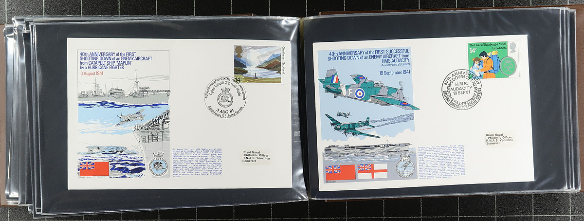 Military / Forces Anniversary Covers (many signed). Clean collection of roughly 250 Great Britain military commemorative covers in three cover albums, from a few different series. The majority of covers relate to the Royal Navy, along with a few from the Royal Air Force, commemorating many important events, ships, planes, participants, battles, and more, ranging from World War I to the 1990's. Many covers appear to be signed by one or more participants relating to the topic at hand. A nice lot for the military, topical or thematic collector. Estimate =
