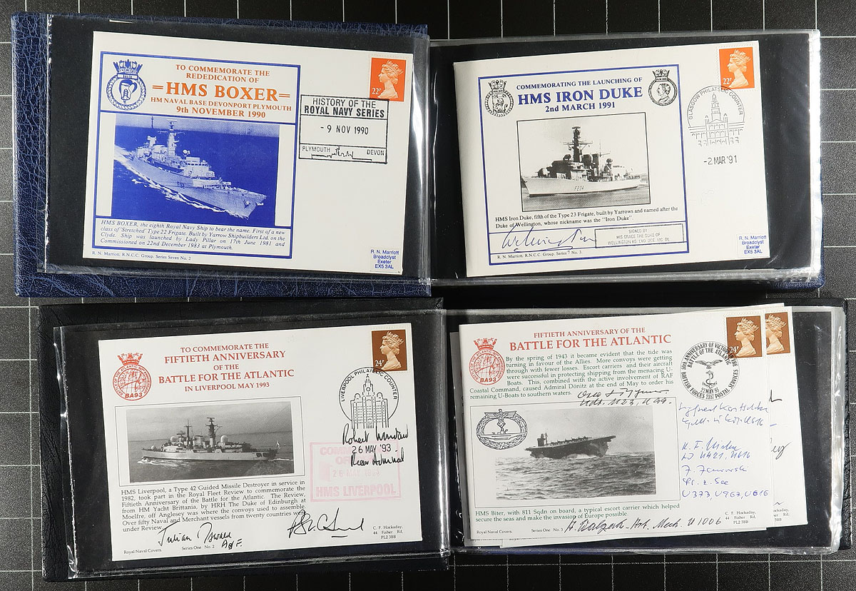 Military / Forces Anniversary Covers (many signed). Clean collection of roughly 250 Great Britain military commemorative covers in three cover albums, from a few different series. The majority of covers relate to the Royal Navy, along with a few from the Royal Air Force, commemorating many important events, ships, planes, participants, battles, and more, ranging from World War I to the 1990's. Many covers appear to be signed by one or more participants relating to the topic at hand. A nice lot for the military, topical or thematic collector. Estimate =