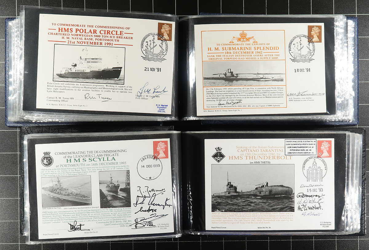 Military / Forces Anniversary Covers (many signed). Clean collection of roughly 250 Great Britain military commemorative covers in three cover albums, from a few different series. The majority of covers relate to the Royal Navy, along with a few from the Royal Air Force, commemorating many important events, ships, planes, participants, battles, and more, ranging from World War I to the 1990's. Many covers appear to be signed by one or more participants relating to the topic at hand. A nice lot for the military, topical or thematic collector. Estimate =
