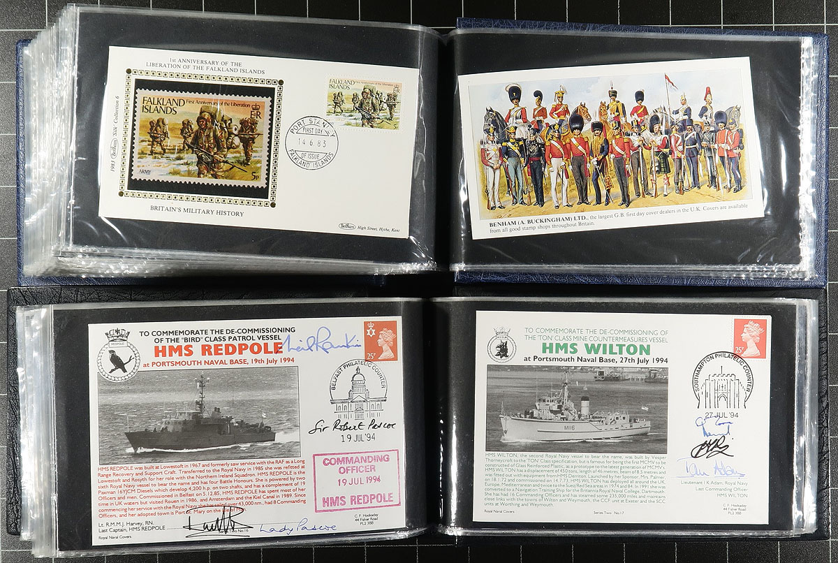 Military / Forces Anniversary Covers (many signed). Clean collection of roughly 250 Great Britain military commemorative covers in three cover albums, from a few different series. The majority of covers relate to the Royal Navy, along with a few from the Royal Air Force, commemorating many important events, ships, planes, participants, battles, and more, ranging from World War I to the 1990's. Many covers appear to be signed by one or more participants relating to the topic at hand. A nice lot for the military, topical or thematic collector. Estimate =