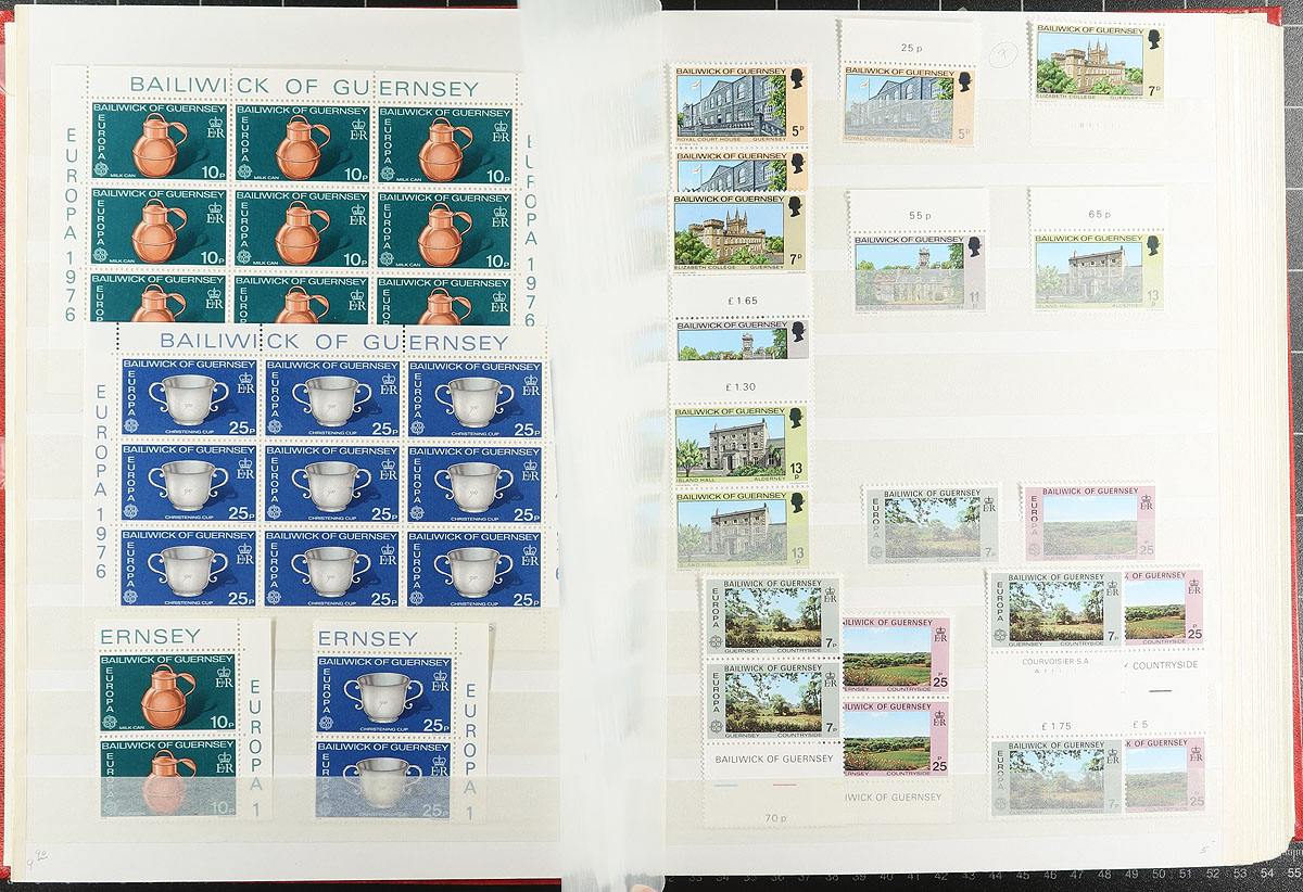 Guernsey. Nice collection / accumulation of never hinged Guernsey, 1974-1998, containing over 1,000 stamps in a stockbook. The collection generally ranges from Scott #95/635, including a few souvenir sheets and booklet panes, along with examples of postage dues. Duplication up to three for a few issues. A nice organized collection for collectors and dealers alike. 2026 Scott US$922.00 =