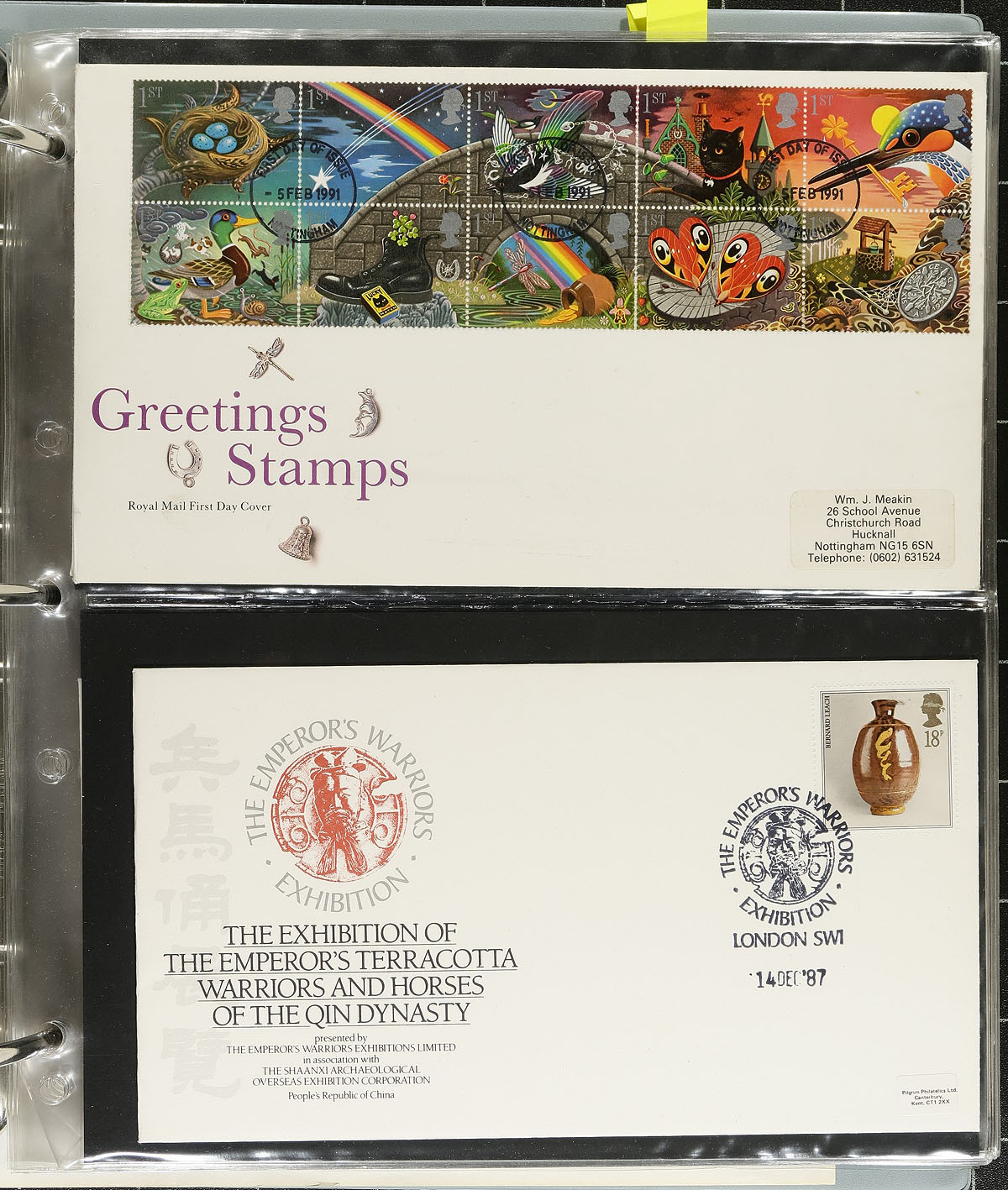 Collection of roughly 240 Great Britain first day covers, 1970's-2007, in several 2-row stock pages in 3 binders. We note roughly 75 cacheted special event first day covers, including a few real photo cachets, along with singles, sets, booklet panes, and souvenir sheet frankings. A lovely clean group. Estimate =