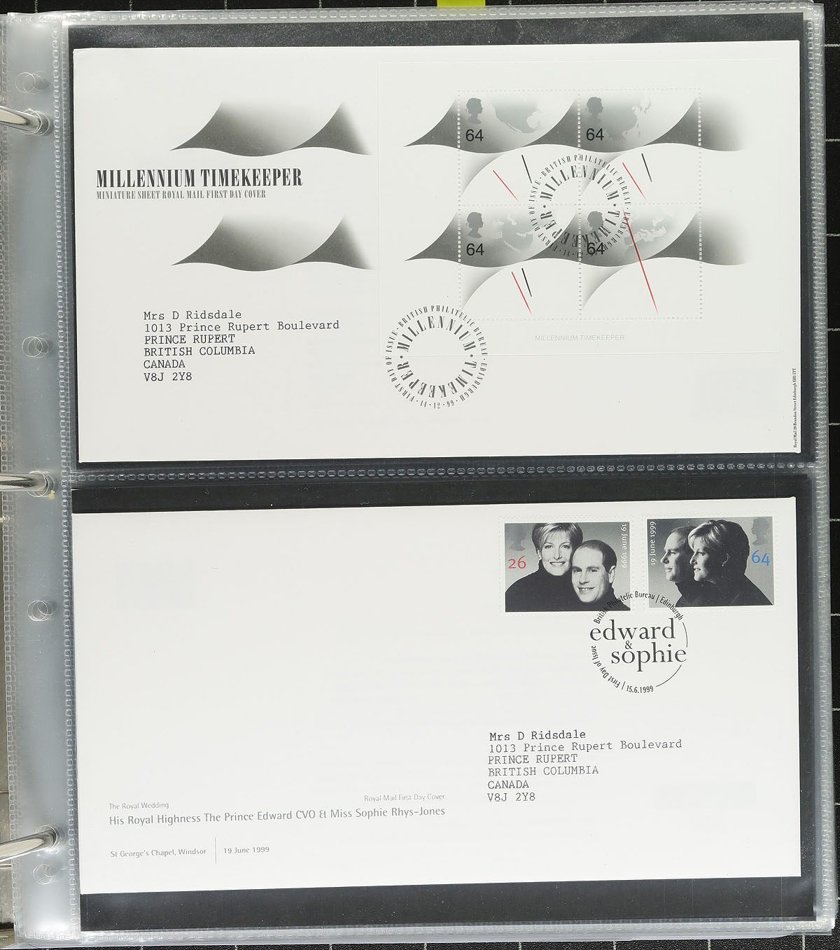 Collection of roughly 240 Great Britain first day covers, 1970's-2007, in several 2-row stock pages in 3 binders. We note roughly 75 cacheted special event first day covers, including a few real photo cachets, along with singles, sets, booklet panes, and souvenir sheet frankings. A lovely clean group. Estimate =