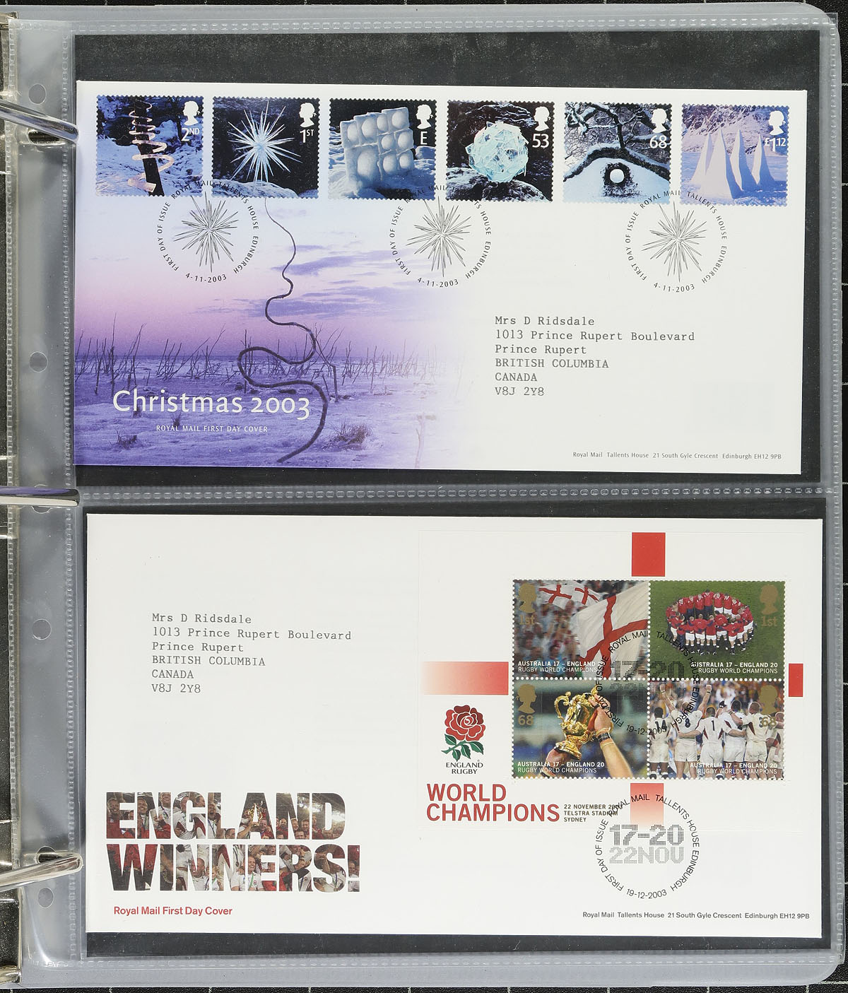 Collection of roughly 240 Great Britain first day covers, 1970's-2007, in several 2-row stock pages in 3 binders. We note roughly 75 cacheted special event first day covers, including a few real photo cachets, along with singles, sets, booklet panes, and souvenir sheet frankings. A lovely clean group. Estimate =
