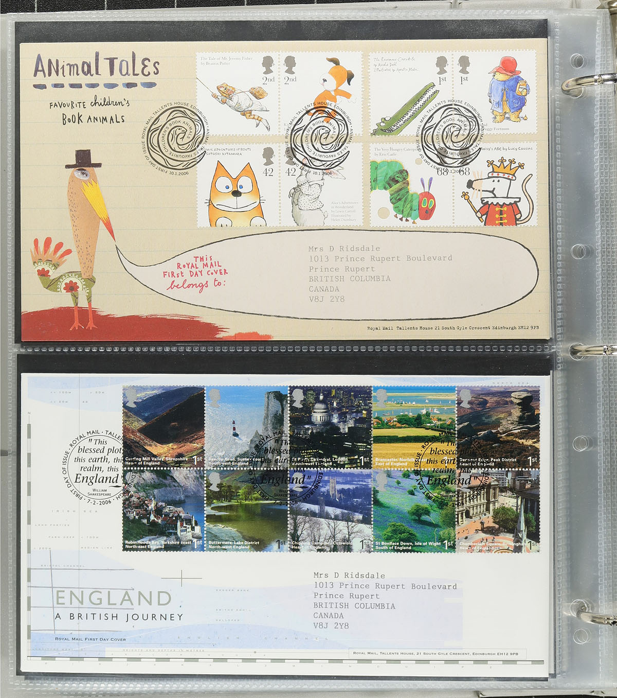 Collection of roughly 240 Great Britain first day covers, 1970's-2007, in several 2-row stock pages in 3 binders. We note roughly 75 cacheted special event first day covers, including a few real photo cachets, along with singles, sets, booklet panes, and souvenir sheet frankings. A lovely clean group. Estimate =