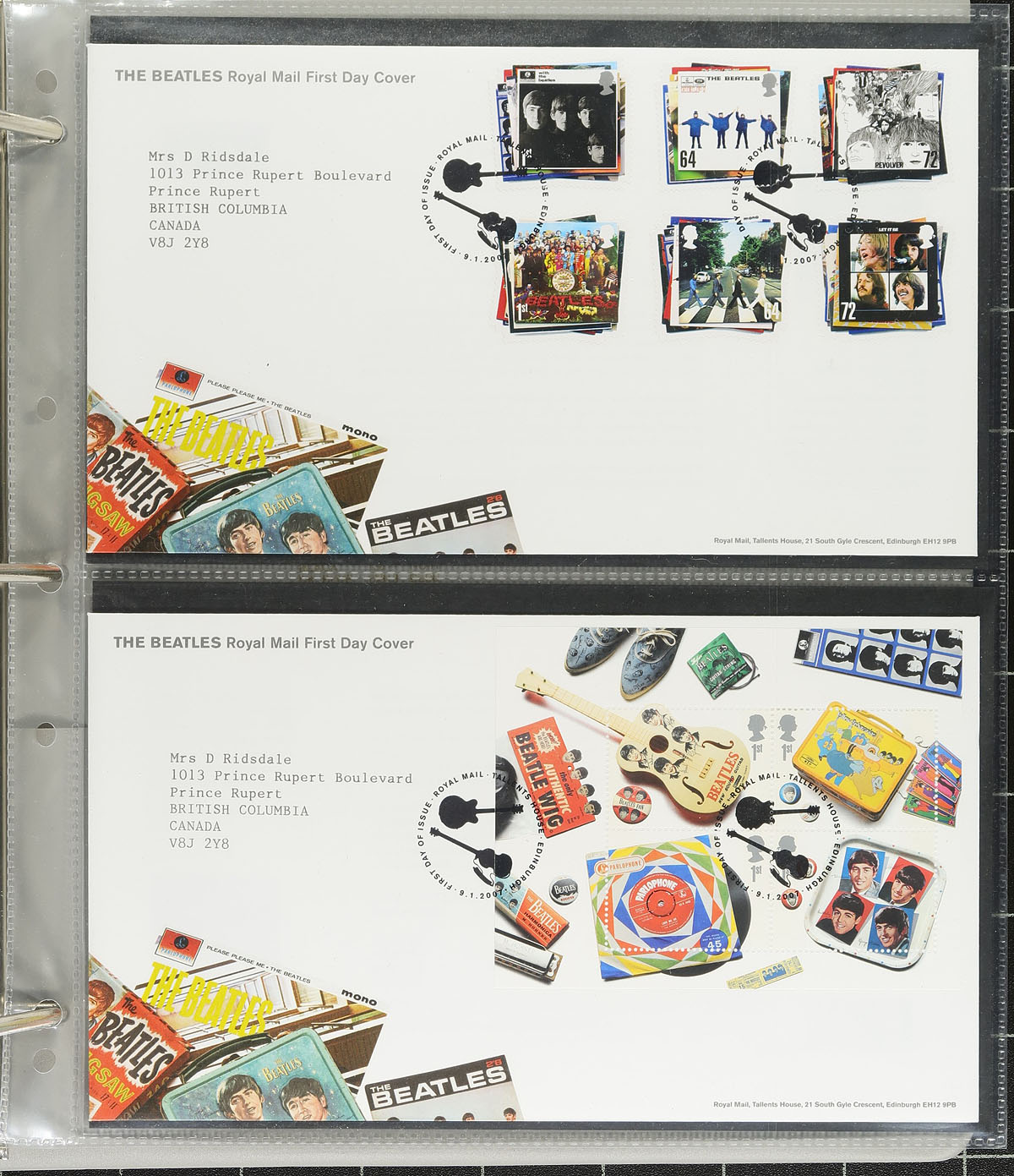 Collection of roughly 240 Great Britain first day covers, 1970's-2007, in several 2-row stock pages in 3 binders. We note roughly 75 cacheted special event first day covers, including a few real photo cachets, along with singles, sets, booklet panes, and souvenir sheet frankings. A lovely clean group. Estimate =