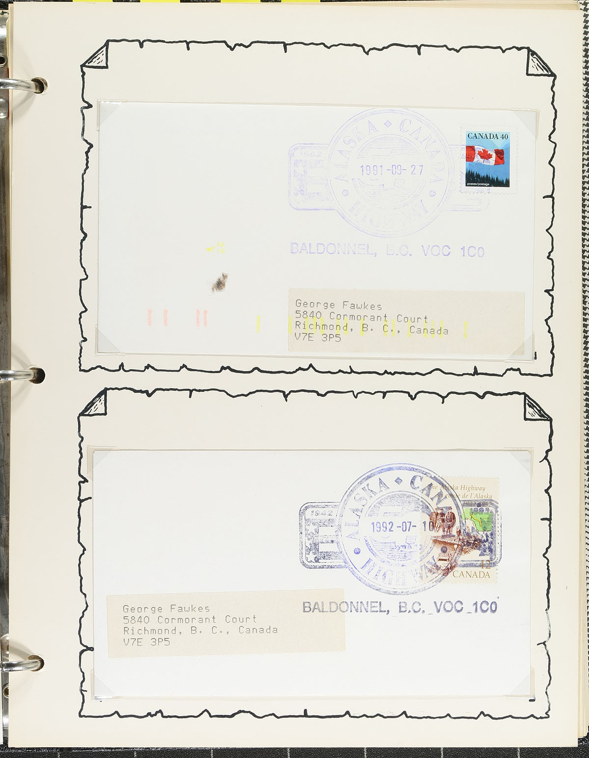 Nice little collection of Alaska Highway anniversary covers, 1991-1992, containing 62 covers, along with some ephemera, representing roughly 30 different towns in British Columbia and the Yukon. Postmarks include Klussendorf, handstamps, and Pictorial town cancels, including Charlie Lake, Toad River, Wonowon, Destruction Bay, Ross River, and more. A nice tidy collection for postmark collectors. Estimate =