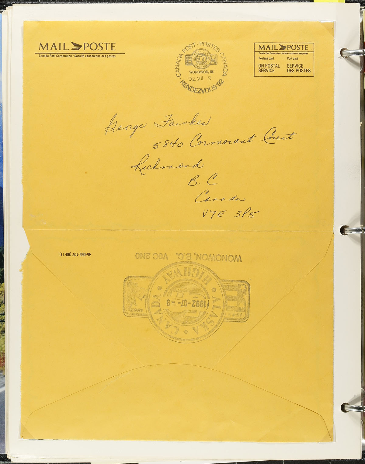 Nice little collection of Alaska Highway anniversary covers, 1991-1992, containing 62 covers, along with some ephemera, representing roughly 30 different towns in British Columbia and the Yukon. Postmarks include Klussendorf, handstamps, and Pictorial town cancels, including Charlie Lake, Toad River, Wonowon, Destruction Bay, Ross River, and more. A nice tidy collection for postmark collectors. Estimate =