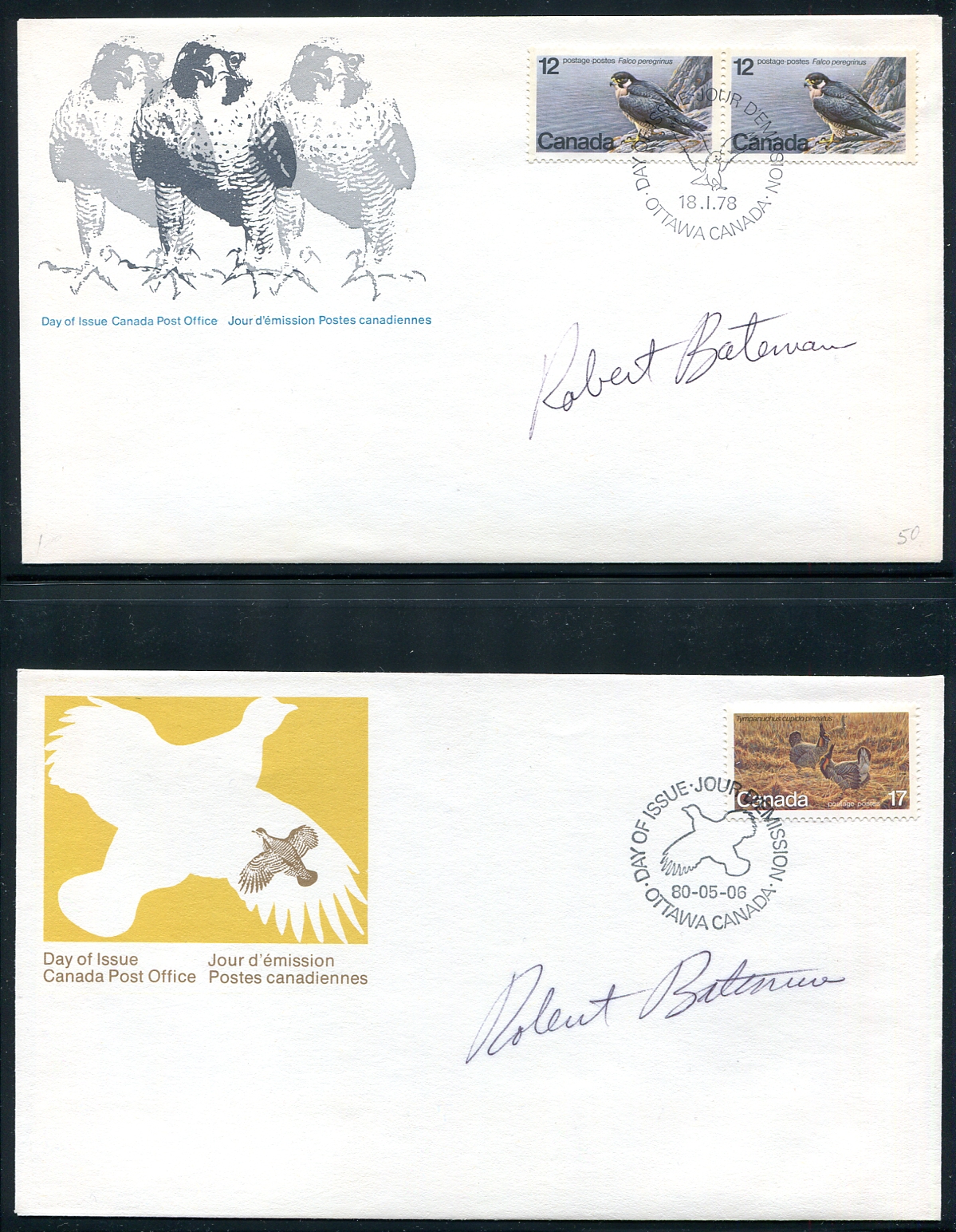 ARTIST SIGNED FDC. A quartet of "Endangered Wildlife" series First Day Covers, including the 1978 Peregrine Falcon, 1979 Bowhead Whale, 1980 Prairie Chicken and 1981 Wood Bison (catalogue numbers #752, 914, 853, 884). All signed by the renowned wildlife artist Robert Bateman. The artwork of Robert Bateman has graced several Canadian stamp issues, as well as several Wildlife Conservation stamps. Estimate =