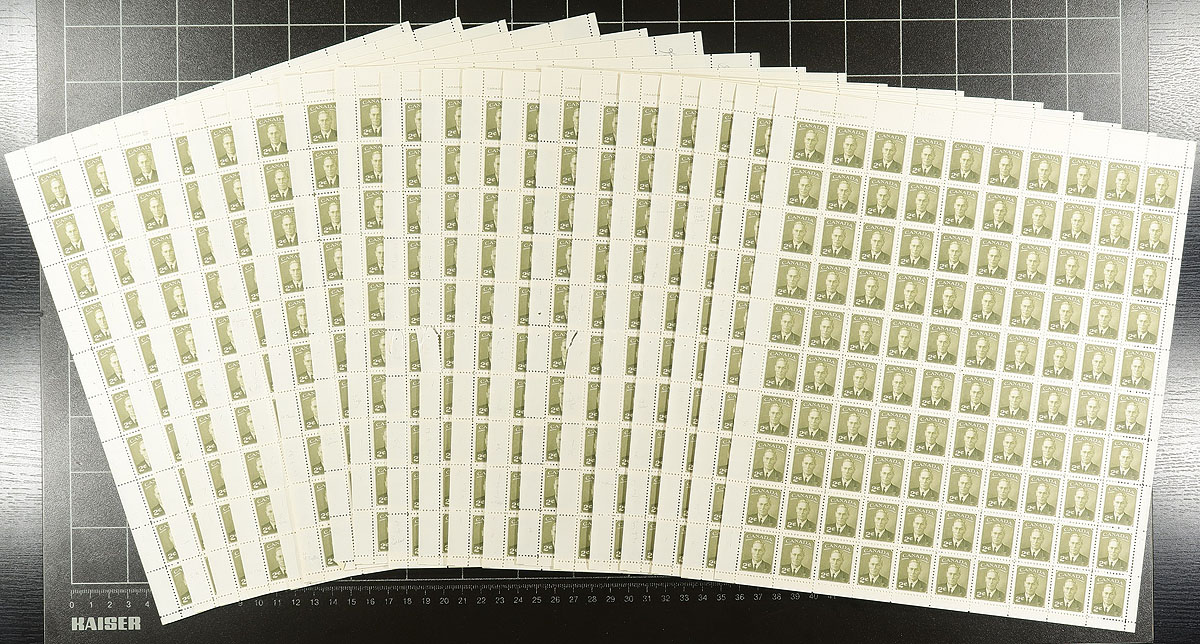 Old-time hoard of 18 complete mint Never Hinged sheets of 100 (1800 stamps in total) of the 1951 issued 2c olive green George VI "Postes-Postage" (new colour issue). All are Plate #8, with inscription in upper-left corner. Purchased at the Post Office at time of issue by the previous owner, there are some very light pencil marks in margin pointing out "fly-specks" in printing which he found (we have valued these all as regular sheets). A few with some minor separation on the selvedge, but overall a clean group of unfolded sheets. Valued as 18 plate blocks, and 1728 stamps. 2024 Unitrade =