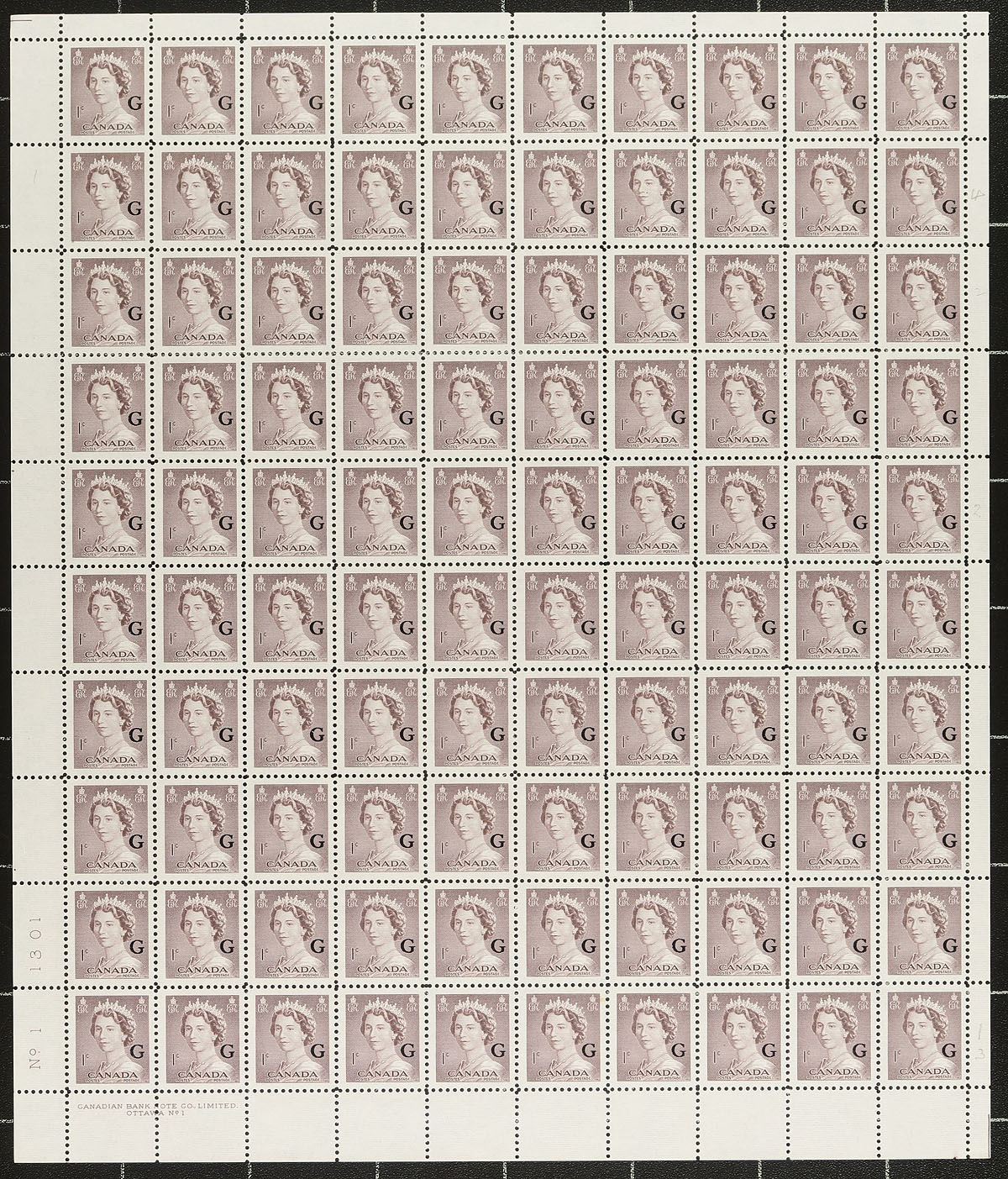 Seven complete "G" overprinted QEII Karsh issue sheets of 100. An interesting group of Post Office fresh sheets of 100 of the 1c violet brown x3 (all Plate #1 in UL, UR, LR panes) and 2c green x4 (Plate #3 in UL, LL, LR and a "field stock"). Obtained from the Post Office by the previous owner and includes a couple pencil notes which point out minor printing irregularities he found. Estimate =