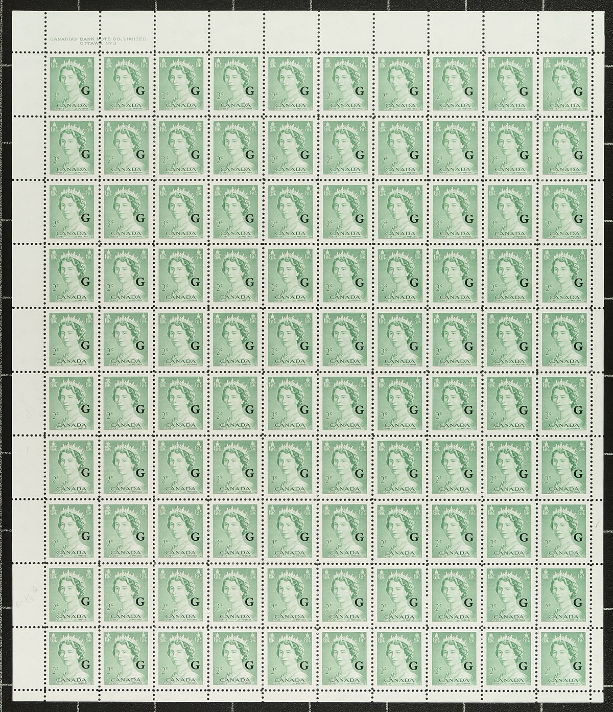 Seven complete "G" overprinted QEII Karsh issue sheets of 100. An interesting group of Post Office fresh sheets of 100 of the 1c violet brown x3 (all Plate #1 in UL, UR, LR panes) and 2c green x4 (Plate #3 in UL, LL, LR and a "field stock"). Obtained from the Post Office by the previous owner and includes a couple pencil notes which point out minor printing irregularities he found. Estimate =