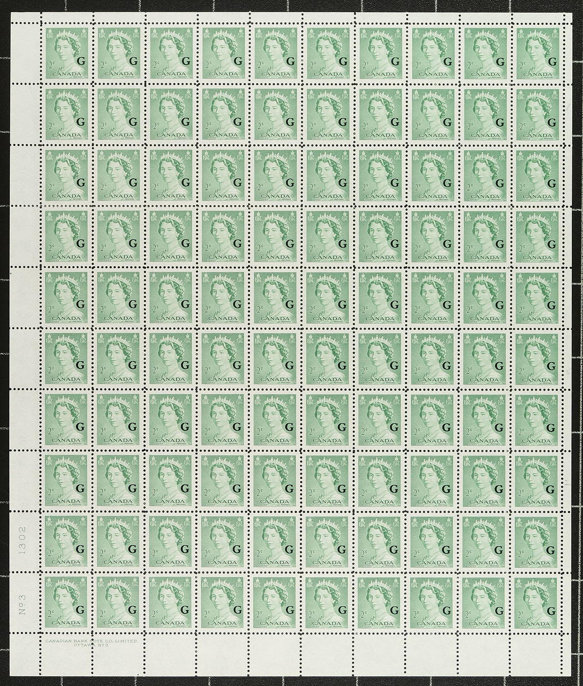 Seven complete "G" overprinted QEII Karsh issue sheets of 100. An interesting group of Post Office fresh sheets of 100 of the 1c violet brown x3 (all Plate #1 in UL, UR, LR panes) and 2c green x4 (Plate #3 in UL, LL, LR and a "field stock"). Obtained from the Post Office by the previous owner and includes a couple pencil notes which point out minor printing irregularities he found. Estimate =