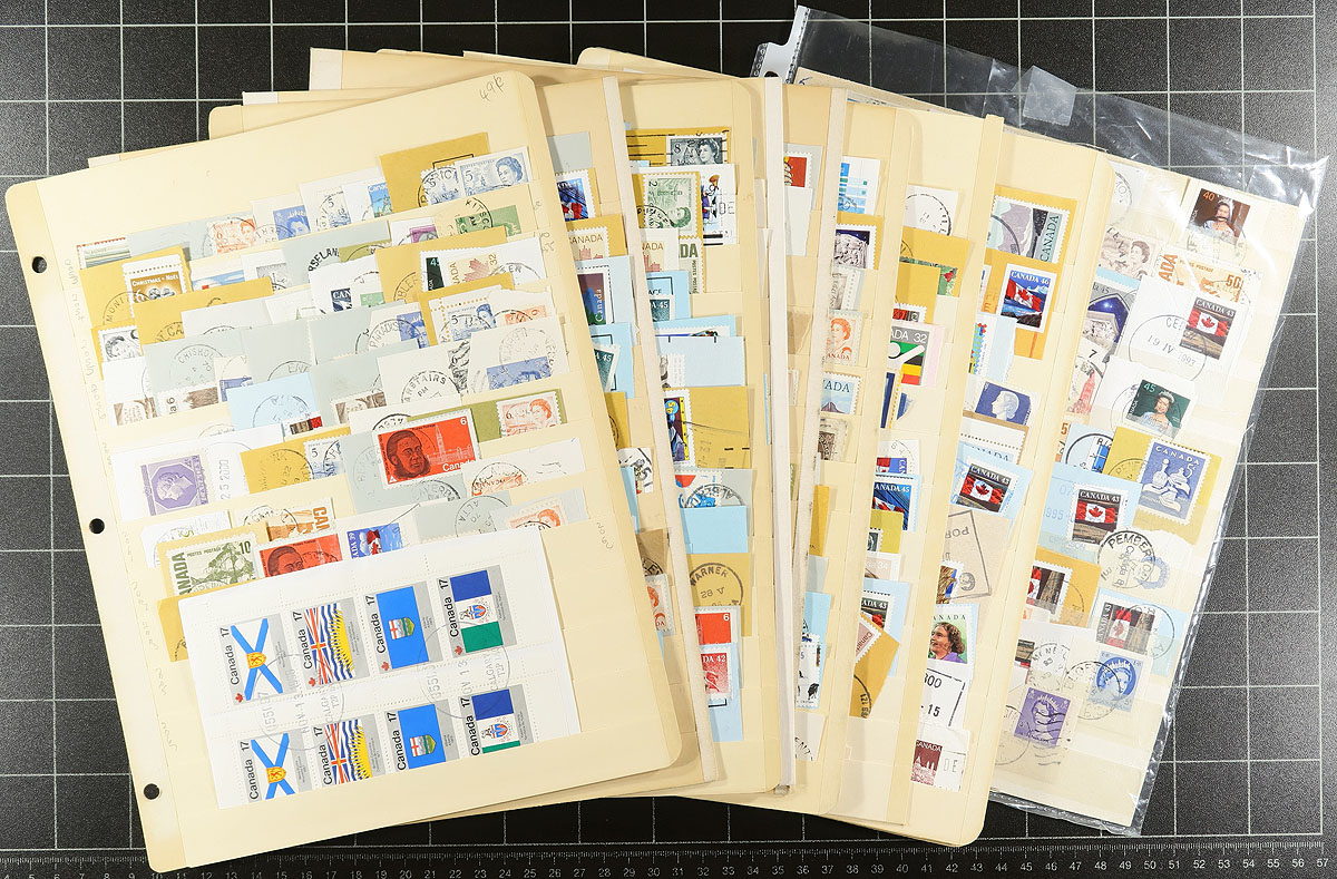 British Columbia and Alberta Postmarks. A binder containing stockpages with BC and Alberta cancels on stamp/piece. Includes 500x Alberta and 260x British Columbia postmarks, mostly from the QEII period, but did notice a few earlier. A nice variety of postmark types noticed including CDS, POCON, Duplex, Retail Centre, MOON etc. Estimate =