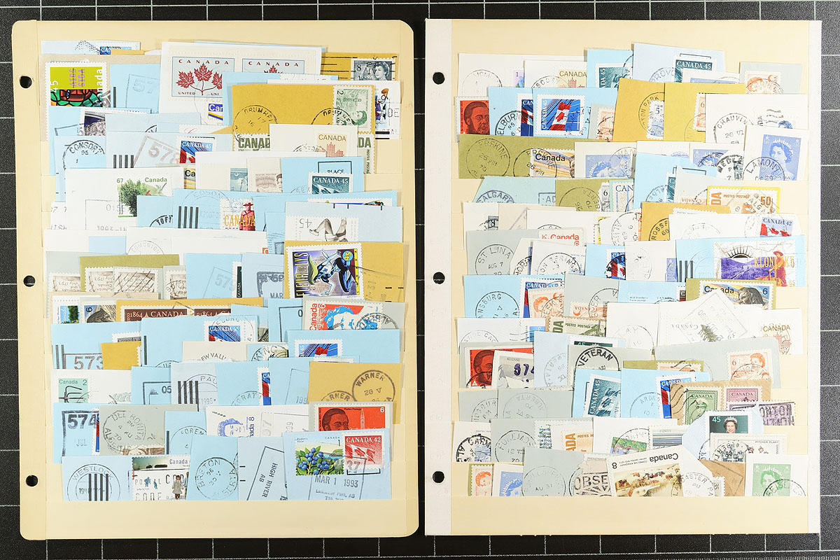 British Columbia and Alberta Postmarks. A binder containing stockpages with BC and Alberta cancels on stamp/piece. Includes 500x Alberta and 260x British Columbia postmarks, mostly from the QEII period, but did notice a few earlier. A nice variety of postmark types noticed including CDS, POCON, Duplex, Retail Centre, MOON etc. Estimate =