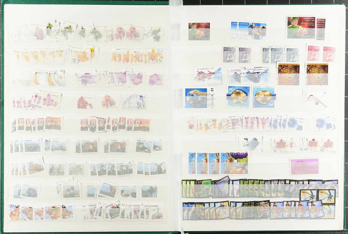 Mostly Modern "Hodge-Podge" of over 2500 stamps off-paper within a 32-page stockbook. While seemingly random, perhaps some as soaked off incoming mail from the consignor, there is a surprising amount of both commemorative and definitive modern issues, up the King Charles issue, plus several pages of $1.00-plus high-values at the back of the book. All pages are shown to appreciate the scope of the lot. Estimate =
