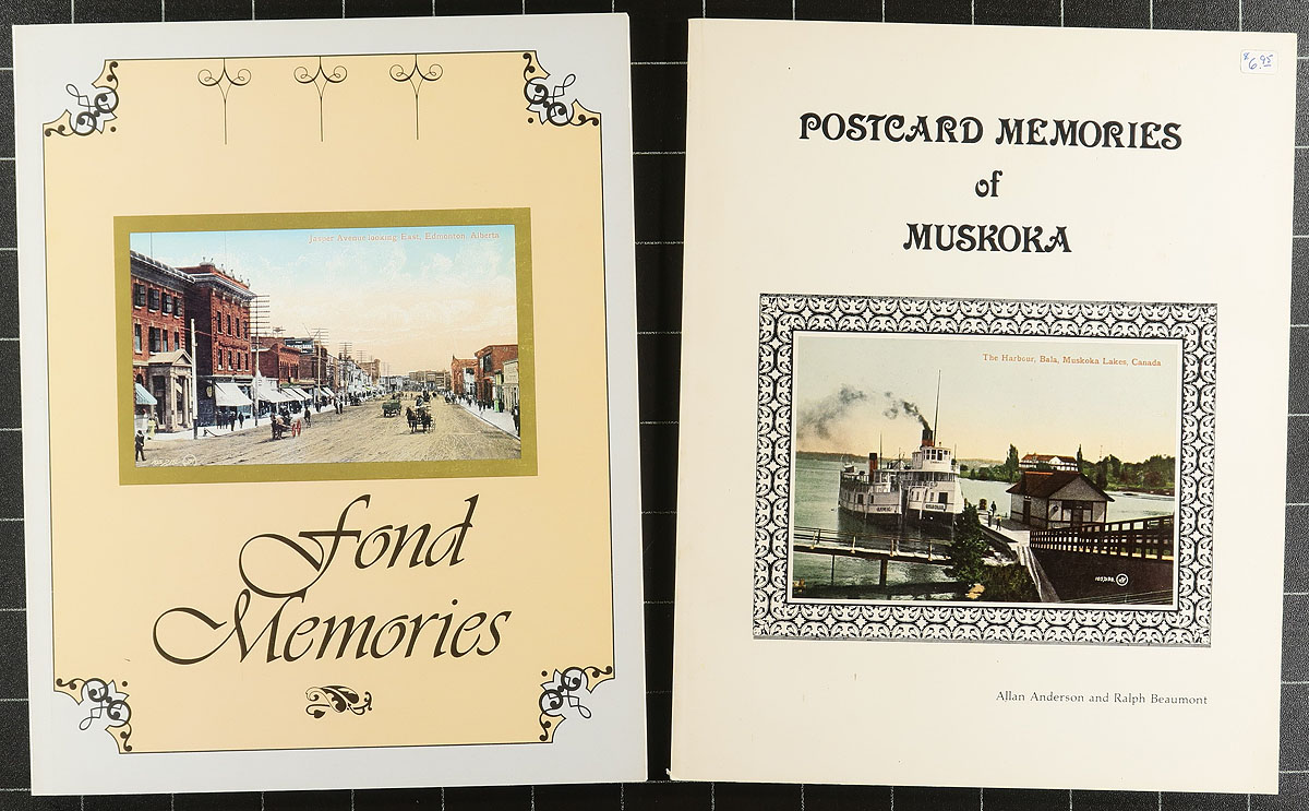 Postcard Literature Group. A small box, packed with a postcard literary punch of 9 different books relating to Canadian postcards. Included (in no particular order) are 1) The Atkinson Bros Picture Postcard Handbook 1899-1911. 2) See You Next Summer, Postcard Memories of Sparrow Lake. 3) "Fond Memories" (postcards of Edmonton, Alberta). 4) Postcard Memories of Muskoka. 5) Vancouver and Beyond, During the Golden Age of Postcards 1900-1914. 6) Places Remembered, Greater Vancouver, New Westminster and the Fraser Valley. 7) The Canadian Patriotic Postcard Checklist 1898-1928. 8) Victoria Revisited. 9) William Notman, The Composite Photographs. A visually enticing group! Estimate =