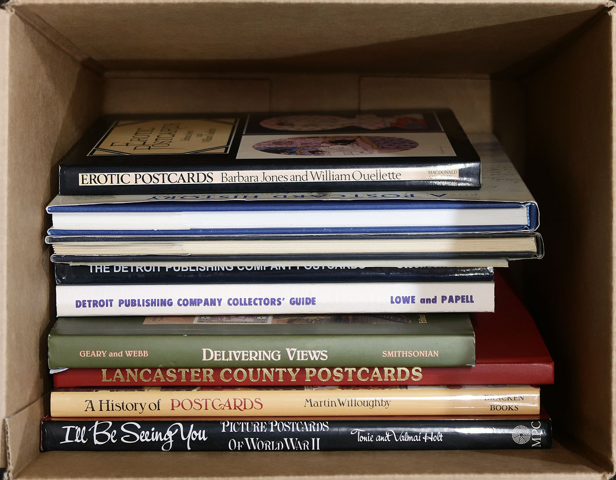 Postcard Literature Group. A visually roller coaster of 9 large postcard related books, from a variety of areas (no Canada, see the Canada Covers section for the Canadian portion). Titles include (in no particular order), 1) I'll be Seeing You, Picture Postcards of World War II. 2) A History of Postcards. 3) Lancaster County Postcards. 4) Delivering Views, Distant Cultures in Picture Postcards. 5) Detroit Publishing Company, Collector's Guide. 6) The Detroit Publishing Company Postcards. 7) Fantasy Postcards. 8) Postcard History of The Passenger Line. 9) Erotic Postcards. Suffice to say, there is significant original cost here! Estimate =