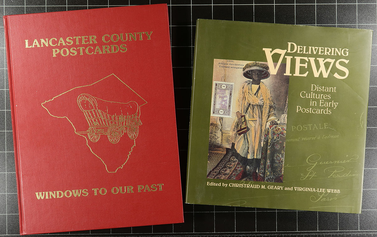 Postcard Literature Group. A visually roller coaster of 9 large postcard related books, from a variety of areas (no Canada, see the Canada Covers section for the Canadian portion). Titles include (in no particular order), 1) I'll be Seeing You, Picture Postcards of World War II. 2) A History of Postcards. 3) Lancaster County Postcards. 4) Delivering Views, Distant Cultures in Picture Postcards. 5) Detroit Publishing Company, Collector's Guide. 6) The Detroit Publishing Company Postcards. 7) Fantasy Postcards. 8) Postcard History of The Passenger Line. 9) Erotic Postcards. Suffice to say, there is significant original cost here! Estimate =