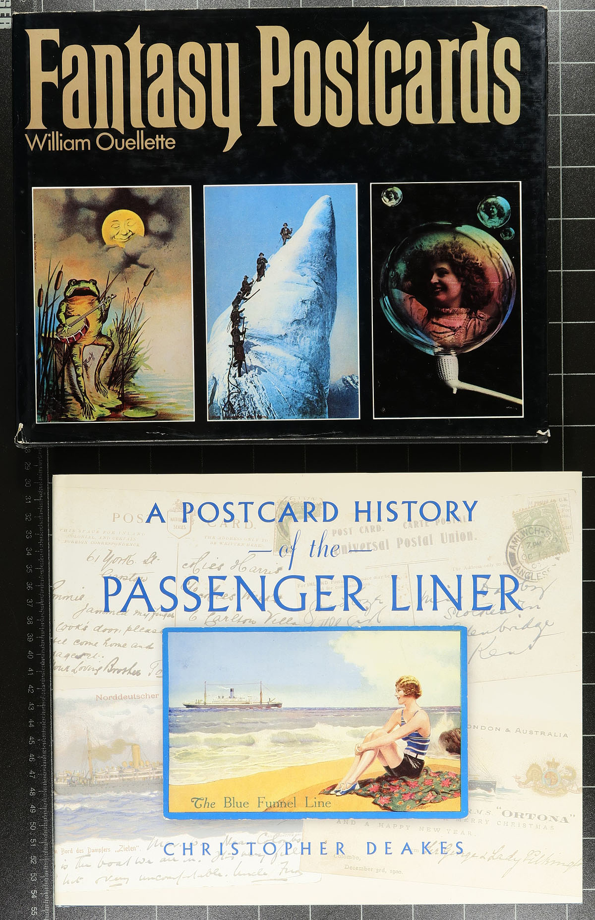 Postcard Literature Group. A visually roller coaster of 9 large postcard related books, from a variety of areas (no Canada, see the Canada Covers section for the Canadian portion). Titles include (in no particular order), 1) I'll be Seeing You, Picture Postcards of World War II. 2) A History of Postcards. 3) Lancaster County Postcards. 4) Delivering Views, Distant Cultures in Picture Postcards. 5) Detroit Publishing Company, Collector's Guide. 6) The Detroit Publishing Company Postcards. 7) Fantasy Postcards. 8) Postcard History of The Passenger Line. 9) Erotic Postcards. Suffice to say, there is significant original cost here! Estimate =