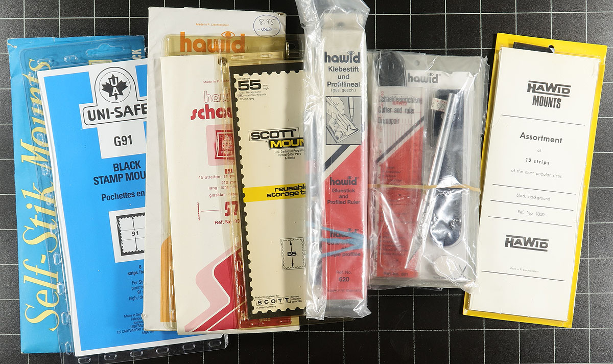 Mount Goldmine. A bankers box (yes, bankers box) as received from a local estate with partially used and intact packages of black and clear plastic mounts, from various brand. Sizes range from single stamps, to large blocks with an excellent diversity of sizes in between. This mount "gold mine" will keep you supplied for years. Original cost easily into the several hundreds of dollars (conservatively). Estimate =