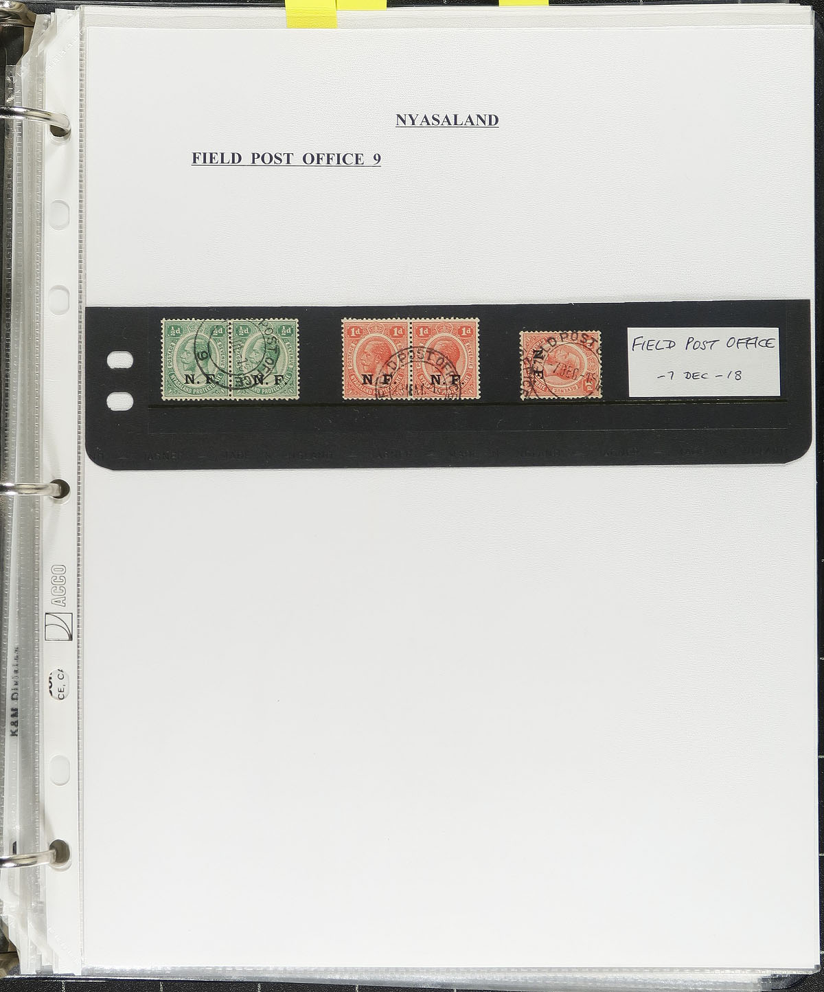 Interesting collection of Nyasaland / Malawi town postmarks, 1890's-1980's, with many hundreds of stamps, on and off piece, on roughly 75 well described pages. The collection has representation from roughly 55 different towns from B to L, along with maps showing the various locations, and some post office information and populations (some very small towns), noting Ekwendeni, Embangweni, and Limbe, just to name a few. Postmarks include CDS handstamps, military posts (noting Fort Anderson, Fort Hill, Fort Manning), and more. A very nice collection that should be further studied. Estimate =