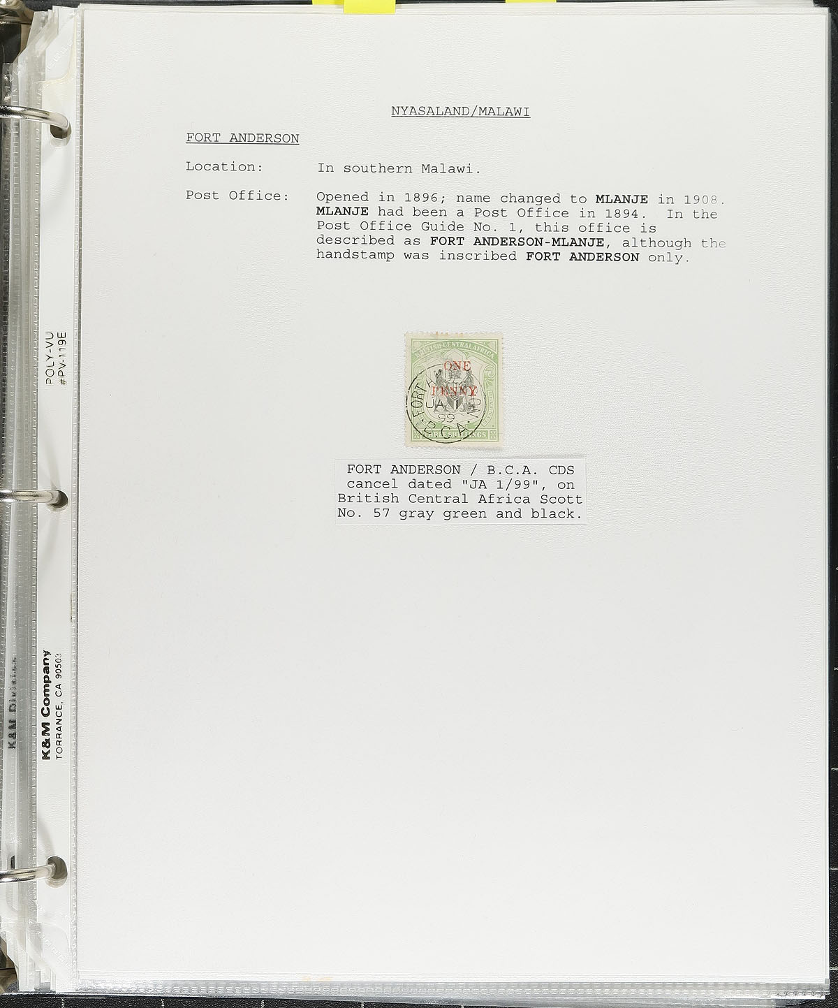 Interesting collection of Nyasaland / Malawi town postmarks, 1890's-1980's, with many hundreds of stamps, on and off piece, on roughly 75 well described pages. The collection has representation from roughly 55 different towns from B to L, along with maps showing the various locations, and some post office information and populations (some very small towns), noting Ekwendeni, Embangweni, and Limbe, just to name a few. Postmarks include CDS handstamps, military posts (noting Fort Anderson, Fort Hill, Fort Manning), and more. A very nice collection that should be further studied. Estimate =