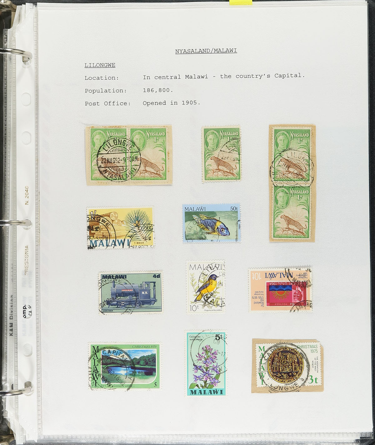 Interesting collection of Nyasaland / Malawi town postmarks, 1890's-1980's, with many hundreds of stamps, on and off piece, on roughly 75 well described pages. The collection has representation from roughly 55 different towns from B to L, along with maps showing the various locations, and some post office information and populations (some very small towns), noting Ekwendeni, Embangweni, and Limbe, just to name a few. Postmarks include CDS handstamps, military posts (noting Fort Anderson, Fort Hill, Fort Manning), and more. A very nice collection that should be further studied. Estimate =