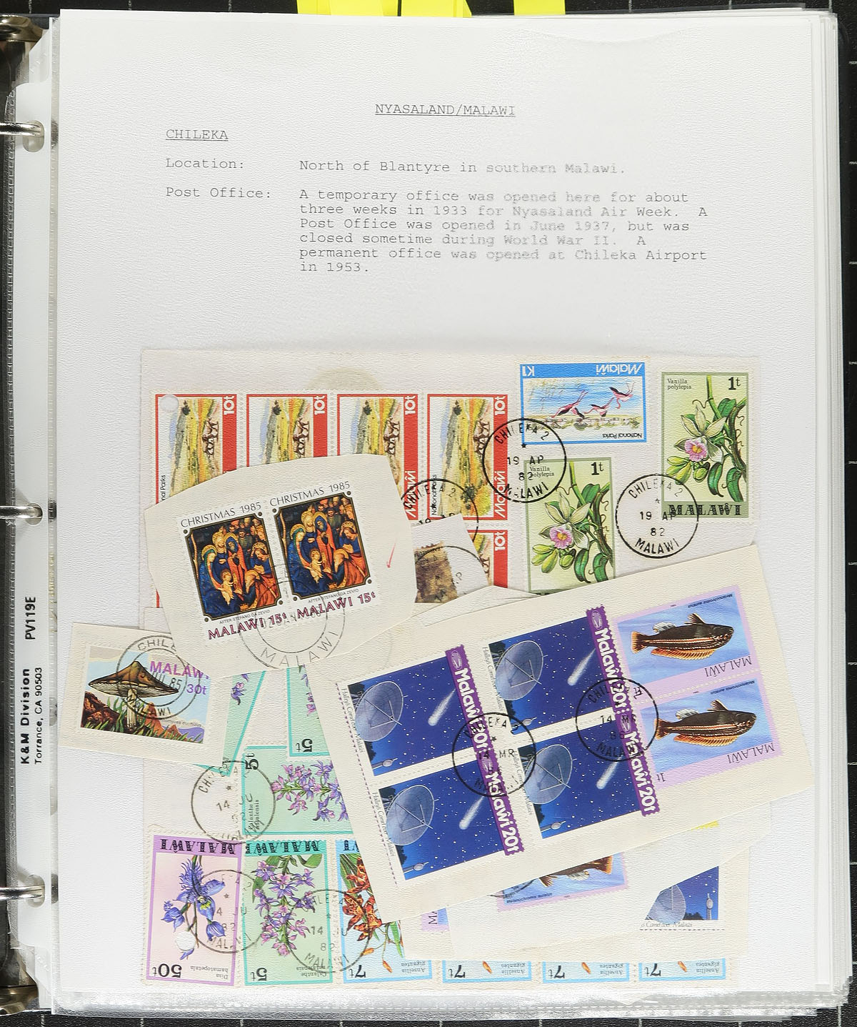 Interesting collection of Nyasaland / Malawi town postmarks, 1890's-1980's, with many hundreds of stamps, on and off piece, on roughly 75 well described pages. The collection has representation from roughly 55 different towns from B to L, along with maps showing the various locations, and some post office information and populations (some very small towns), noting Ekwendeni, Embangweni, and Limbe, just to name a few. Postmarks include CDS handstamps, military posts (noting Fort Anderson, Fort Hill, Fort Manning), and more. A very nice collection that should be further studied. Estimate =