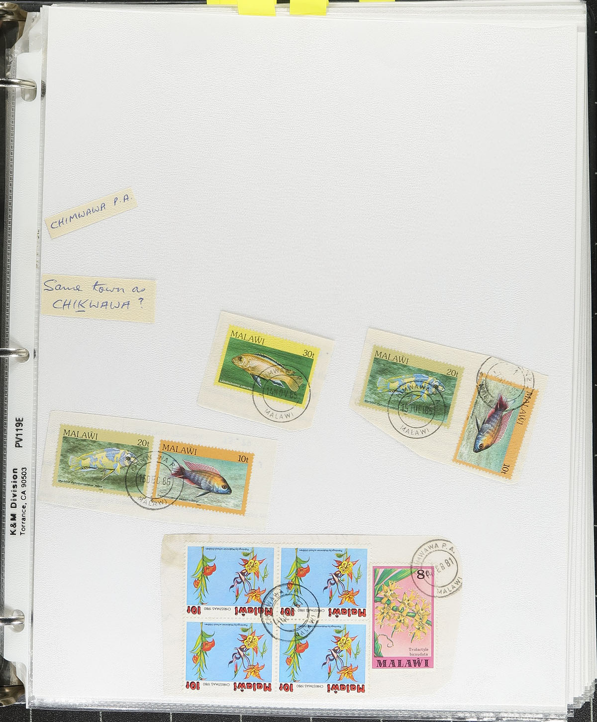 Interesting collection of Nyasaland / Malawi town postmarks, 1890's-1980's, with many hundreds of stamps, on and off piece, on roughly 75 well described pages. The collection has representation from roughly 55 different towns from B to L, along with maps showing the various locations, and some post office information and populations (some very small towns), noting Ekwendeni, Embangweni, and Limbe, just to name a few. Postmarks include CDS handstamps, military posts (noting Fort Anderson, Fort Hill, Fort Manning), and more. A very nice collection that should be further studied. Estimate =