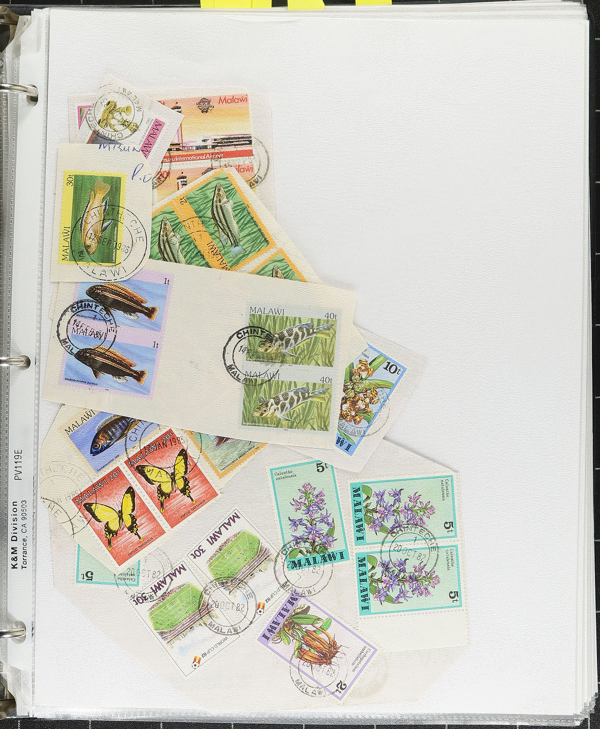 Interesting collection of Nyasaland / Malawi town postmarks, 1890's-1980's, with many hundreds of stamps, on and off piece, on roughly 75 well described pages. The collection has representation from roughly 55 different towns from B to L, along with maps showing the various locations, and some post office information and populations (some very small towns), noting Ekwendeni, Embangweni, and Limbe, just to name a few. Postmarks include CDS handstamps, military posts (noting Fort Anderson, Fort Hill, Fort Manning), and more. A very nice collection that should be further studied. Estimate =