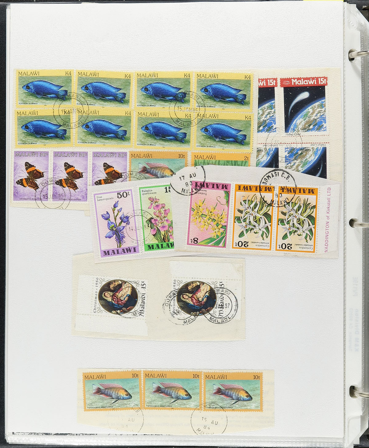Interesting collection of Nyasaland / Malawi town postmarks, 1890's-1980's, with many hundreds of stamps, on and off piece, on roughly 75 well described pages. The collection has representation from roughly 55 different towns from B to L, along with maps showing the various locations, and some post office information and populations (some very small towns), noting Ekwendeni, Embangweni, and Limbe, just to name a few. Postmarks include CDS handstamps, military posts (noting Fort Anderson, Fort Hill, Fort Manning), and more. A very nice collection that should be further studied. Estimate =