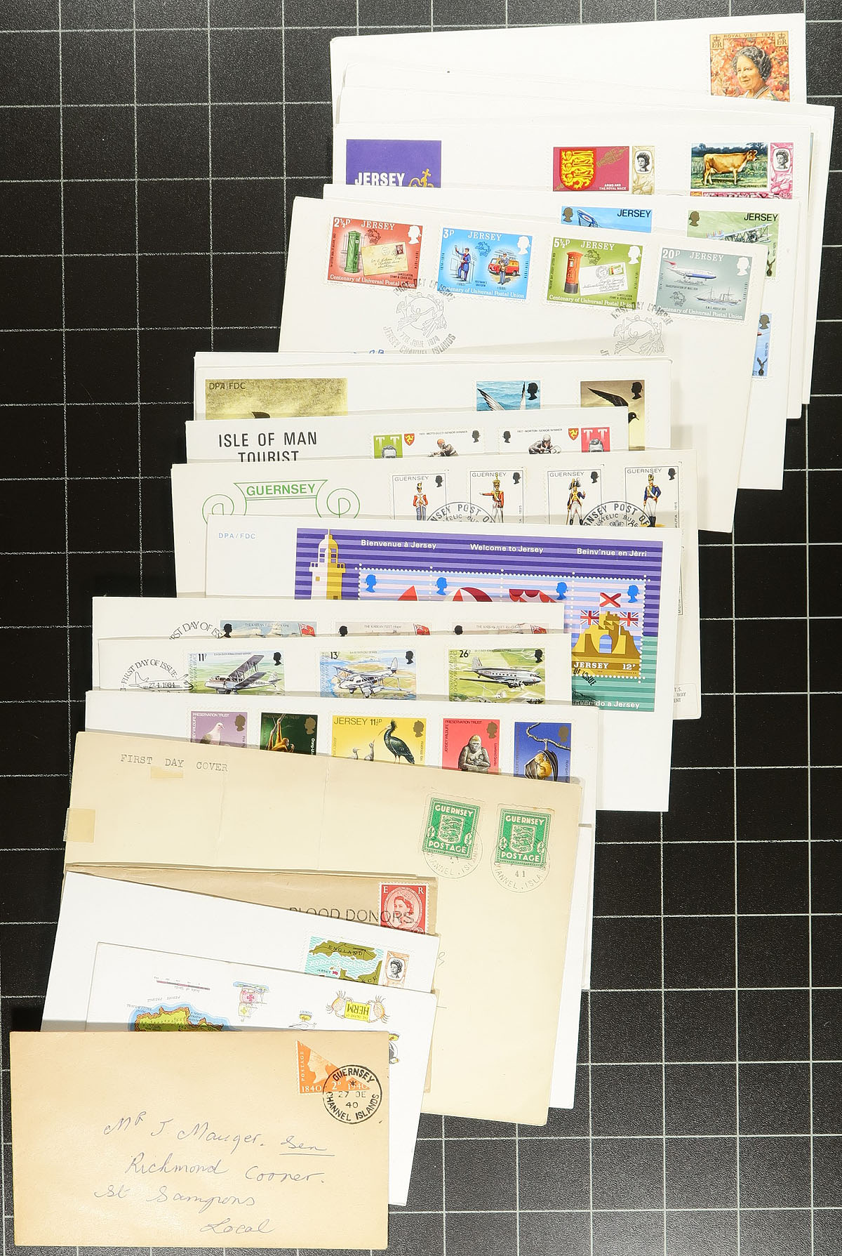 Group of roughly 240 Channel Islands covers, 1960's-1980's, containing 124 "Colorado Silk" cacheted first day covers, ranging from 1979-1981 (Isle of Man x38, Guernsey x38, Jersey x48; original retail price $496), along with mostly other first day covers having singles, sets, and souvenir sheet frankings, a few Herm Island covers, philatelic services mail, a few maximum cards, 2 philatelic bisect covers, and more. Overall fine to very fine. Estimate =