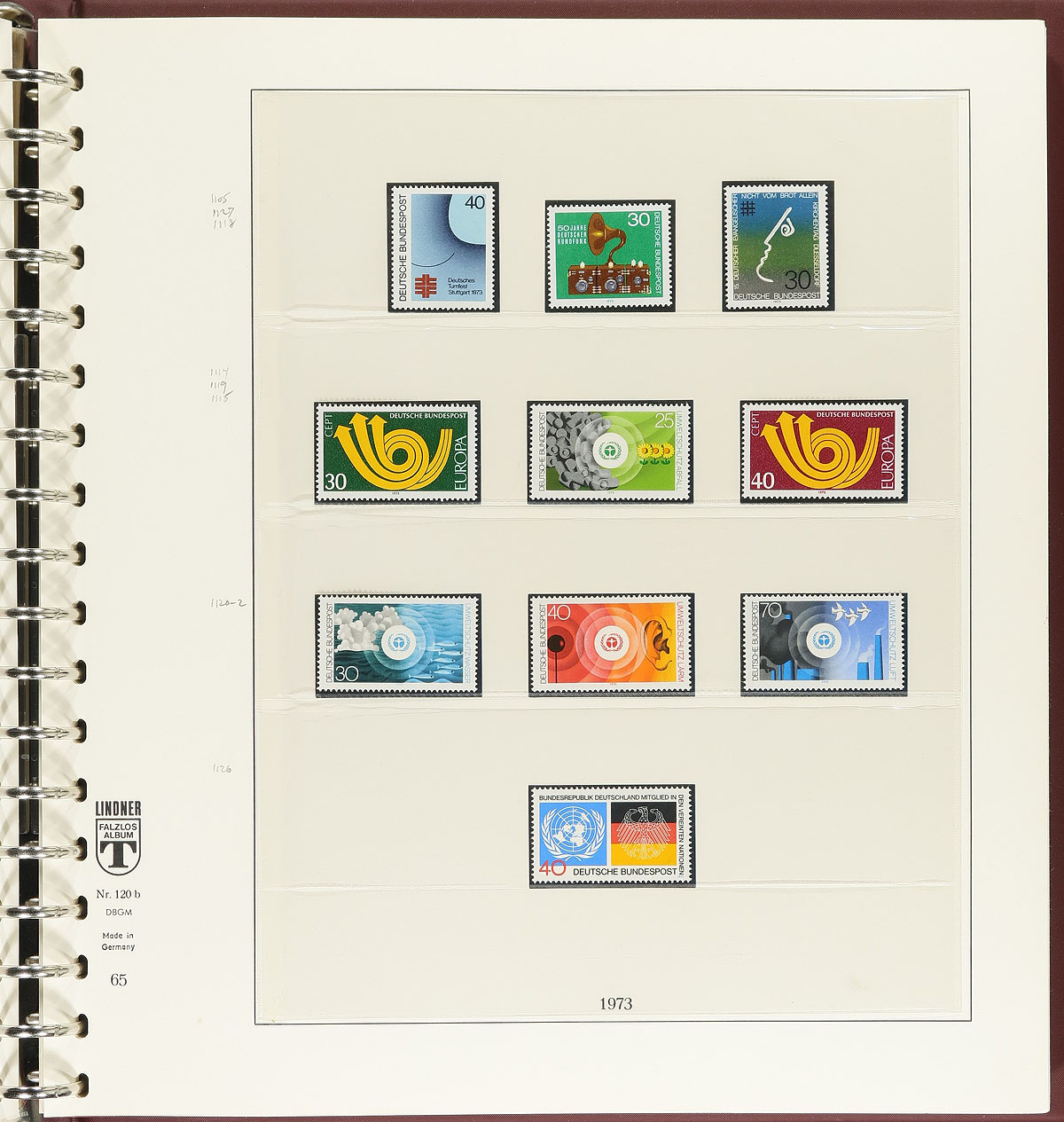Collection of mint Germany, 1936-1979, containing many hundreds of stamps, booklets, and more, in a Lindner album with slipcase, and several homemade pages in a binder. The collection contains singles, sets, souvenir sheets, booklets, semi-postals and more, with the majority of stamps post 1970 being never hinged. Just a few of the better item include Scott #s 539a booklet pane (x5, nh, $102 total), 544a booklet pane (x5, nh, $102 total), B294-B295 (nh, $90 total), along with a sets and a few souvenir sheets cataloguing $10 and up. A nice organized collection. Estimate =