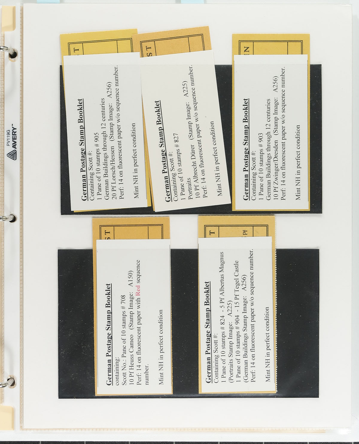Collection of mint Germany, 1936-1979, containing many hundreds of stamps, booklets, and more, in a Lindner album with slipcase, and several homemade pages in a binder. The collection contains singles, sets, souvenir sheets, booklets, semi-postals and more, with the majority of stamps post 1970 being never hinged. Just a few of the better item include Scott #s 539a booklet pane (x5, nh, $102 total), 544a booklet pane (x5, nh, $102 total), B294-B295 (nh, $90 total), along with a sets and a few souvenir sheets cataloguing $10 and up. A nice organized collection. Estimate =