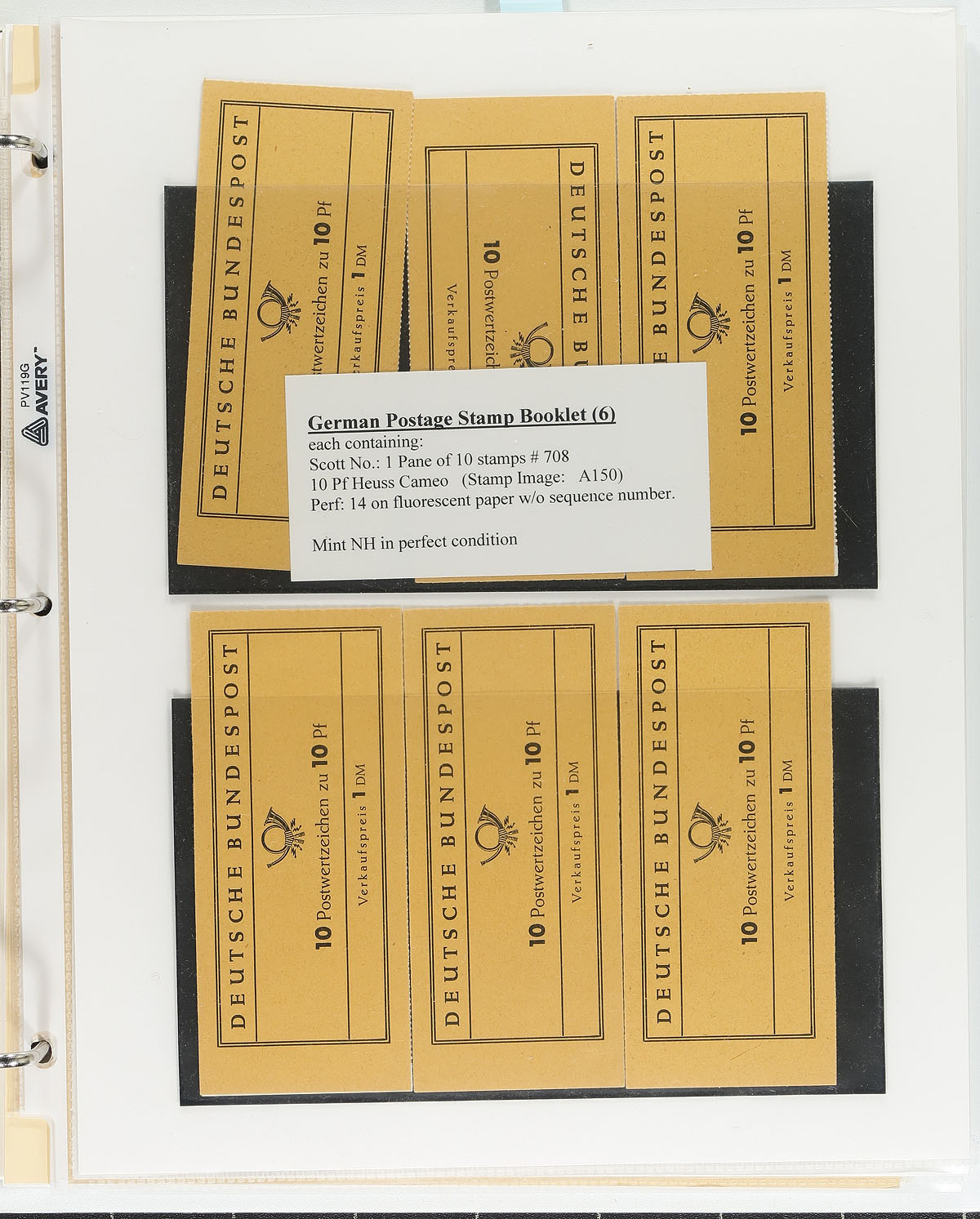 Collection of mint Germany, 1936-1979, containing many hundreds of stamps, booklets, and more, in a Lindner album with slipcase, and several homemade pages in a binder. The collection contains singles, sets, souvenir sheets, booklets, semi-postals and more, with the majority of stamps post 1970 being never hinged. Just a few of the better item include Scott #s 539a booklet pane (x5, nh, $102 total), 544a booklet pane (x5, nh, $102 total), B294-B295 (nh, $90 total), along with a sets and a few souvenir sheets cataloguing $10 and up. A nice organized collection. Estimate =